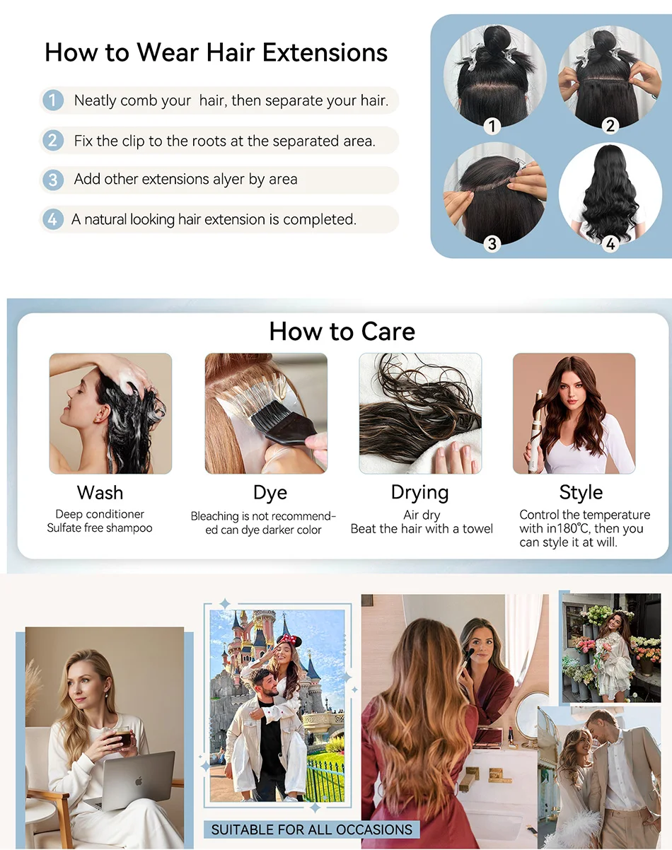 A1: Our hair is real human hair, can be treated as your own hair.The irons should not be heated above 356℉/180°C,do thermal protection when heating, after that, use conditioner or essential oil for care in time, so that it can last longer~ Please don't do it too frequently because it will shorten the lifespan of hair.